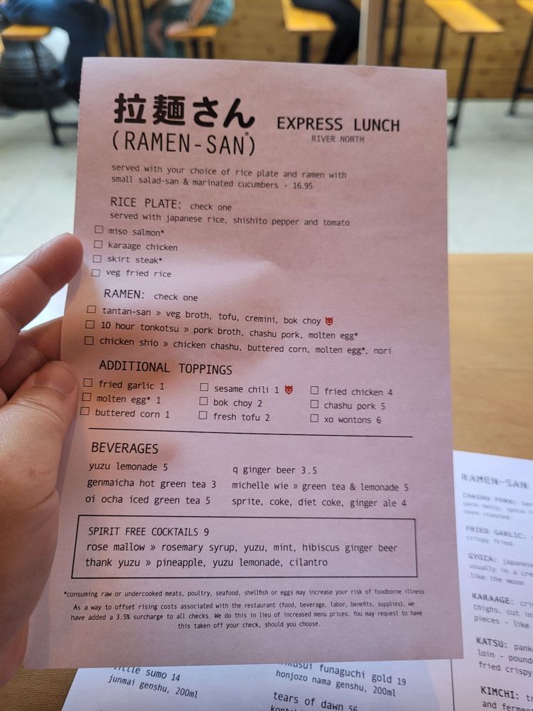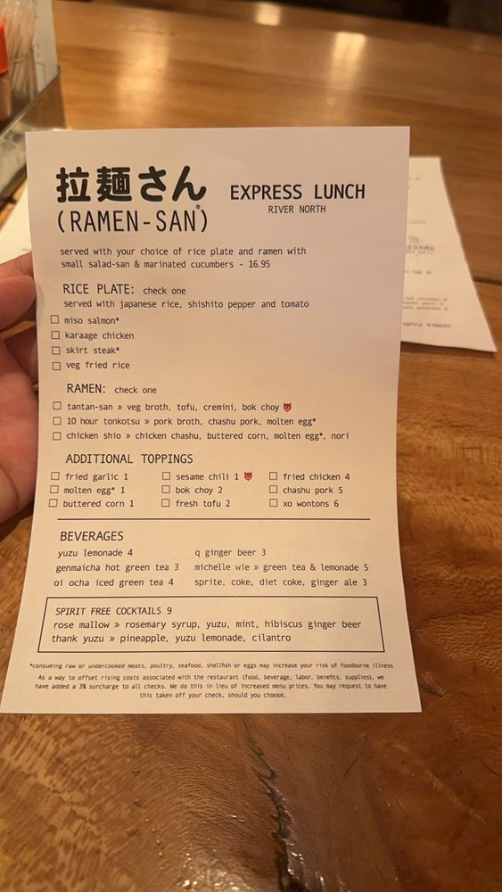 RAMEN-SAN is a trendy and casual ramen spot located in Chicago, offering a variety of options for diners. With a diverse menu that includes pescatarian, soy-free, and vegan choices, there is something for everyone to enjoy. Customers have raved about the flavorful broth and crispy fried chicken in dishes like the kimchi and fried chicken ramen. The ambiance of the restaurant is also praised, with a cozy and welcoming atmosphere for a relaxed meal. The attentive and friendly staff add to the positive experience, making it a great spot for a satisfying and delicious meal. Overall, Ramen-San provides a great value for lunch with its express lunch options, and customers are looking forward to returning for more tasty ramen dishes and delightful appetizers like karaage chicken nuggets.
